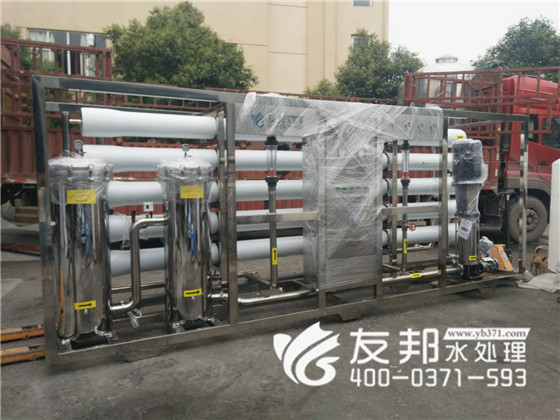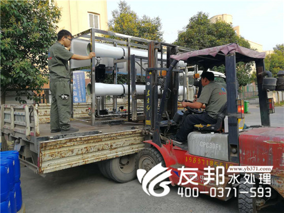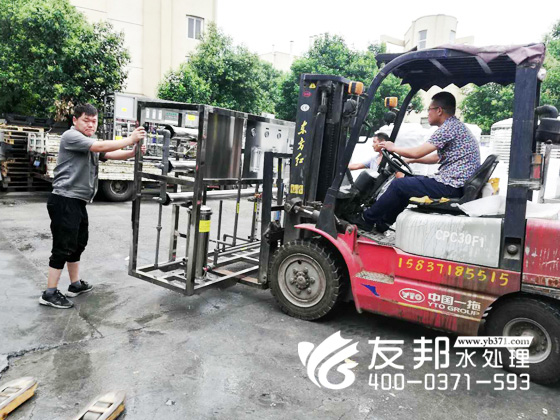 河南友邦型號為YB-CJS-005的反滲透純凈水設備正在裝車發往山東濟南。 5噸每小時小型反滲透純凈水設備就是每小時大出水量是5噸,由于該設備的出水量比較小,一般應用在